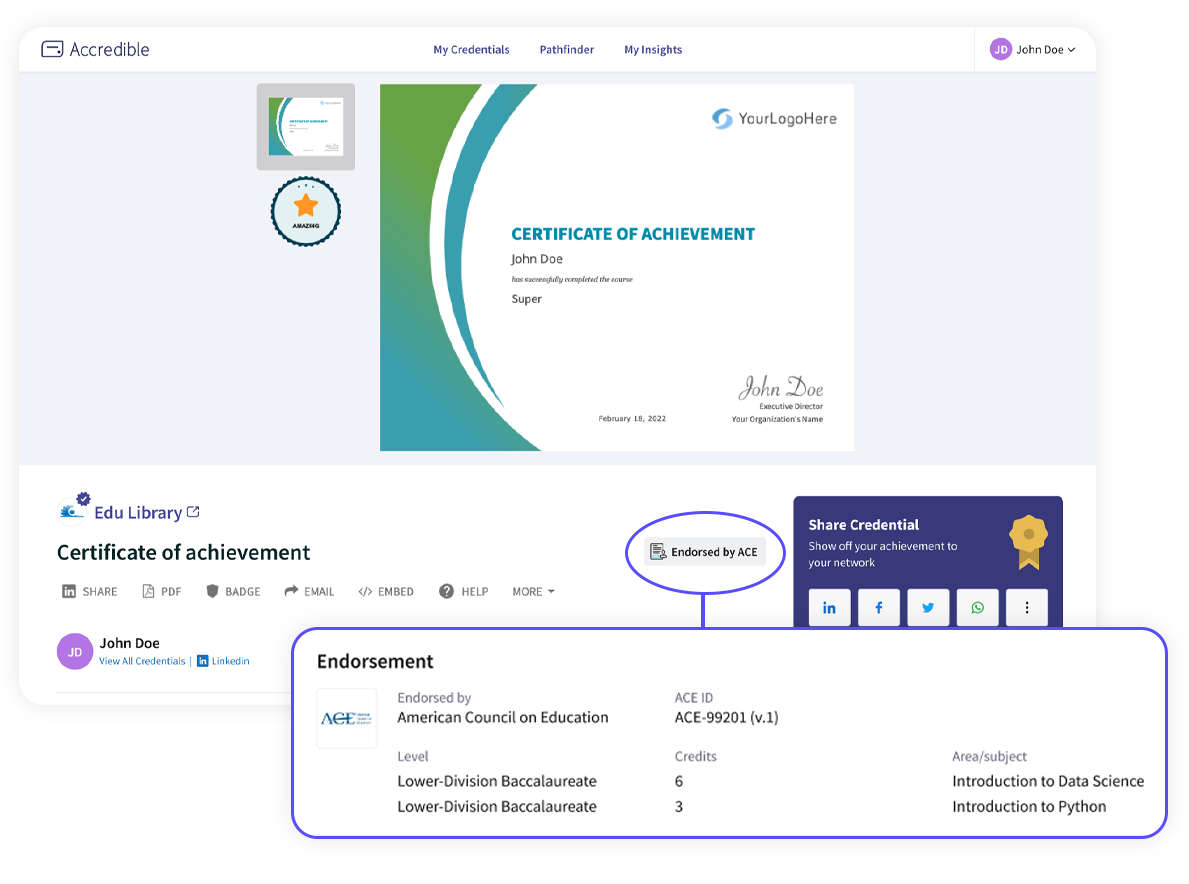 One organization leading the way in credential endorsements is the American Council on Education (ACE), partnering with Accredible. ACE now endorses digital credentials on Accredible’s platform, giving learners access to ACE-endorsed digital certificates and badges that can be counted toward academic credit.