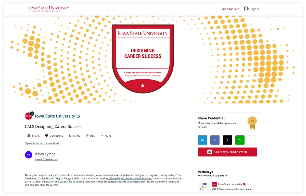 “It had to feel like Iowa State — not a third-party tool. Accredible lets us keep our design standards and institutional branding, while adding all the metadata that makes our credentials meaningful,” Tanya says. “When an employer sees our badges, they know it’s a verified, high-quality microcredential.”