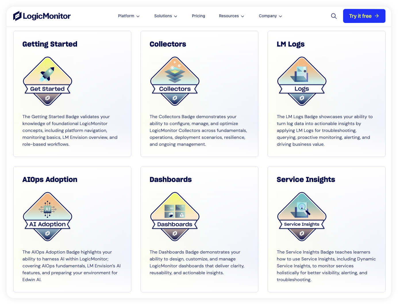 But with a product that expansive and complex, keeping training in lockstep with continuous delivery was an ongoing challenge. By 2024, LogicMonitor’s four certifications were falling out of sync with the product, and the team had limited insight into how learners engaged with or shared their credentials.