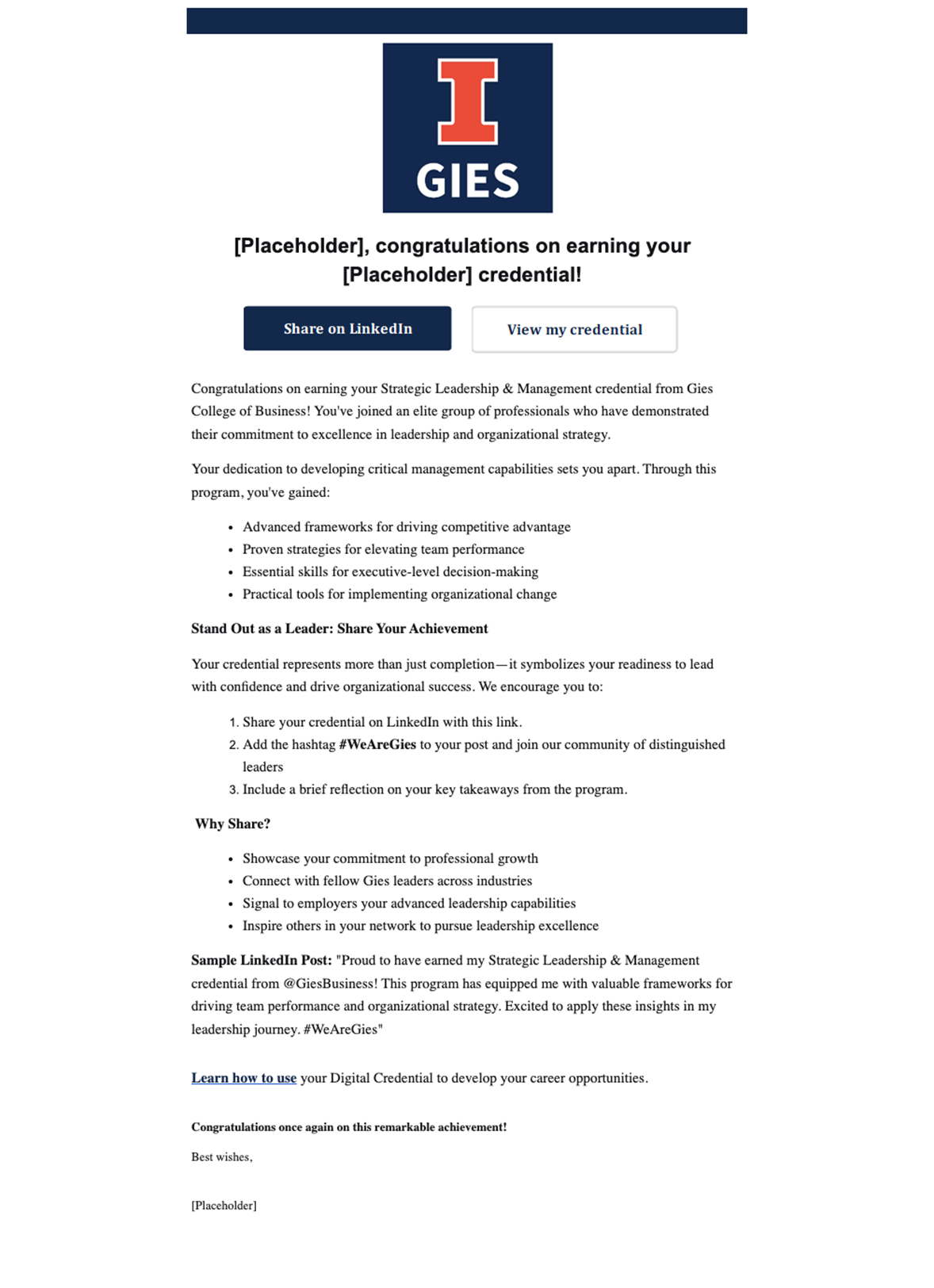 As shown below, the team even includes a sample LinkedIn post at the bottom of credential emails to encourage sharing them online. The staff also uses academic newsletters, advisors, and peers to remind learners of the value of their credentials and nudge them to showcase those credentials in their resumes and professional networks.