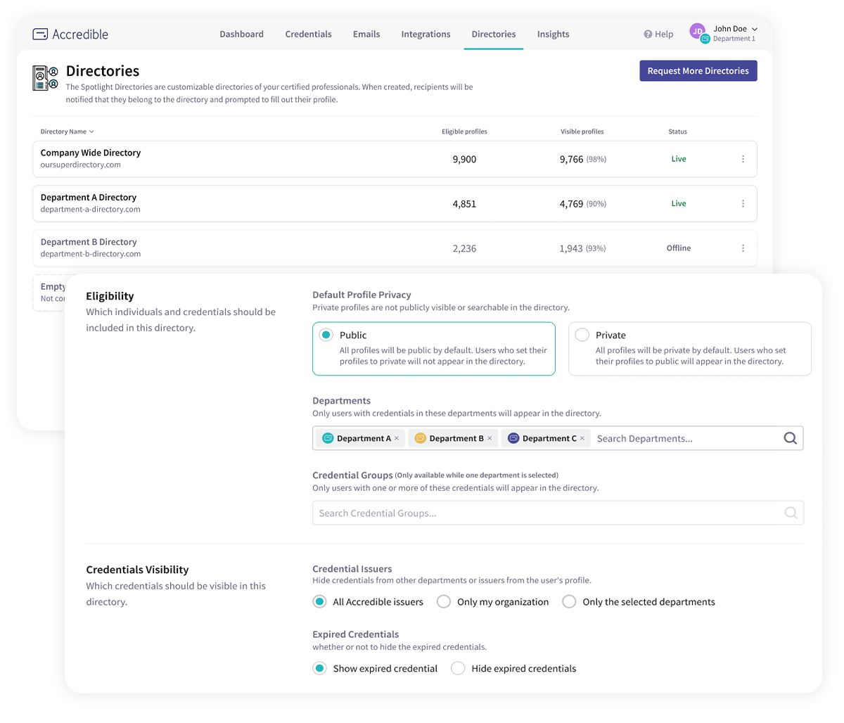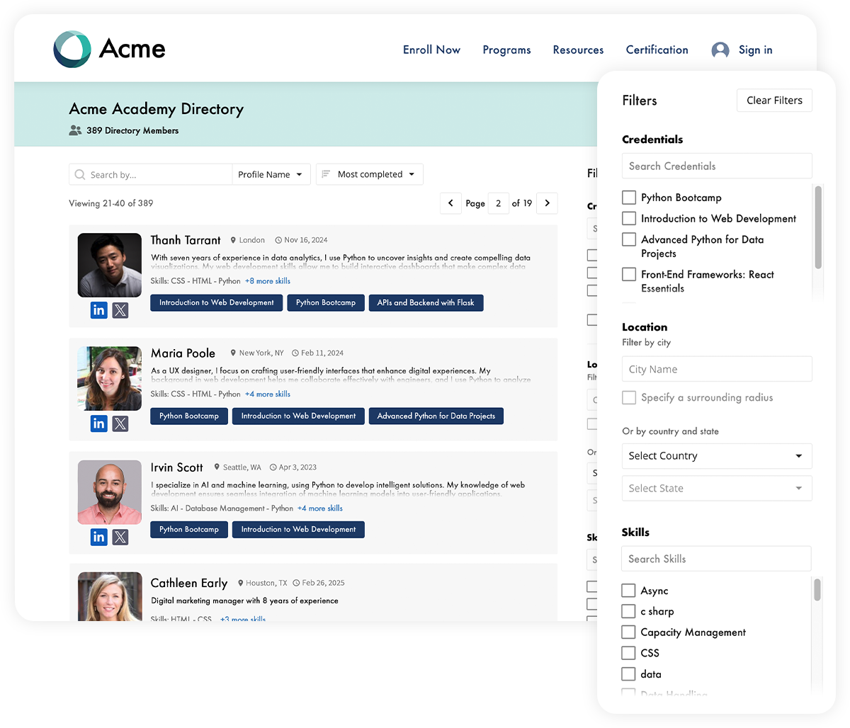 Whether your directory is public or private, you control the visibility. Tailor what credentials appear, highlight specific departments, and define searchable filters that match the needs of your learners and audiences.
