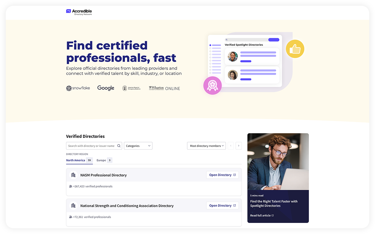Public Spotlight Directories are automatically included in our Accredible Directory Network, a publicly accessible hub that brings together verified credential directories from across the Accredible ecosystem.