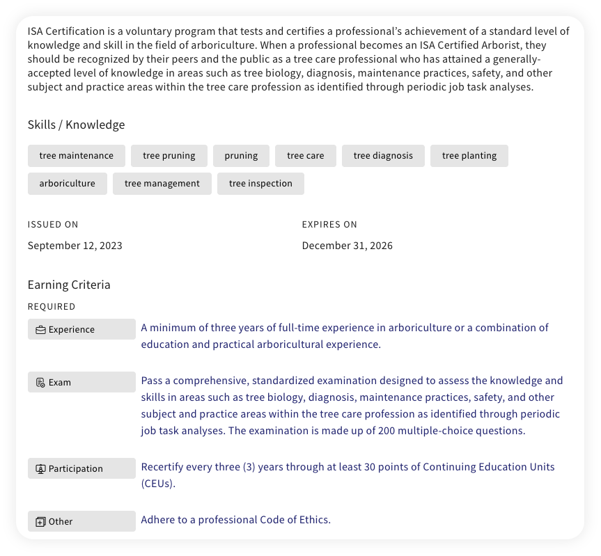Here’s a strong real-world example from the International Society of Arboriculture’s Certified Arborist credential. Notice how it makes the skill areas, validity window, and earning requirements obvious in seconds.