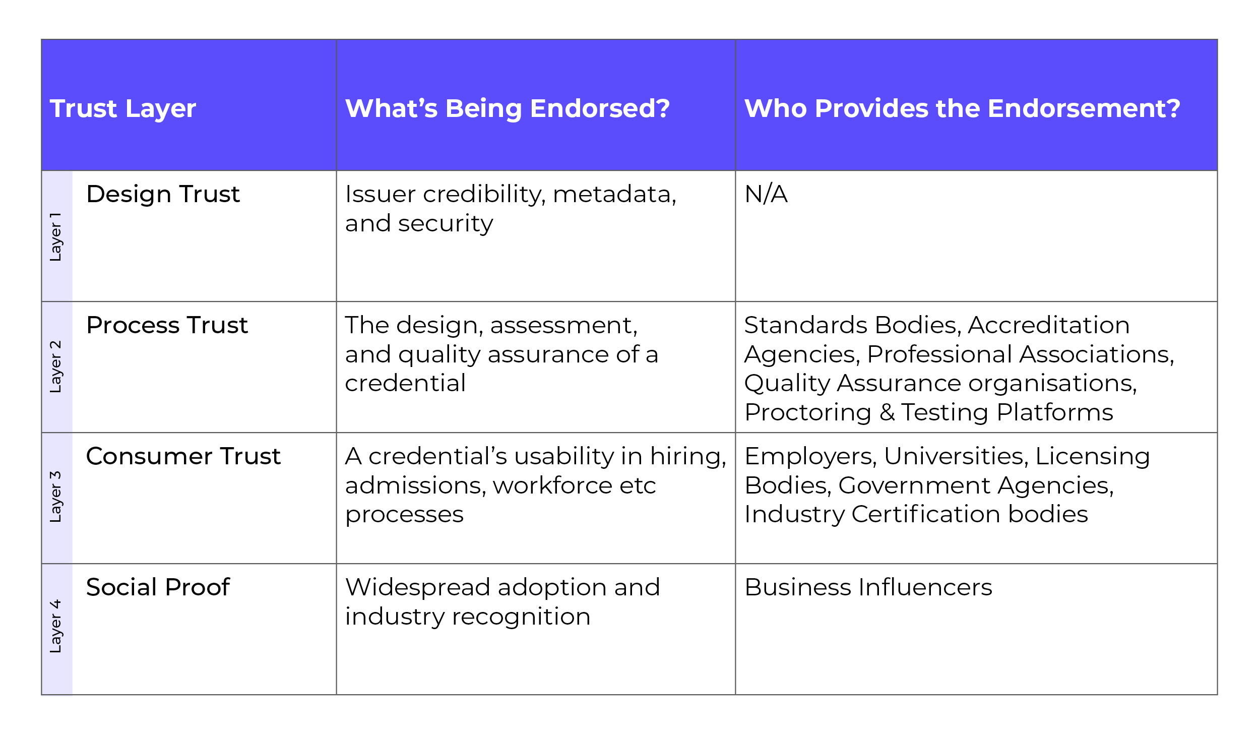 Each type reinforces a different aspect of trust. Together, they surround the credential with a credible, verifiable ecosystem of validation.