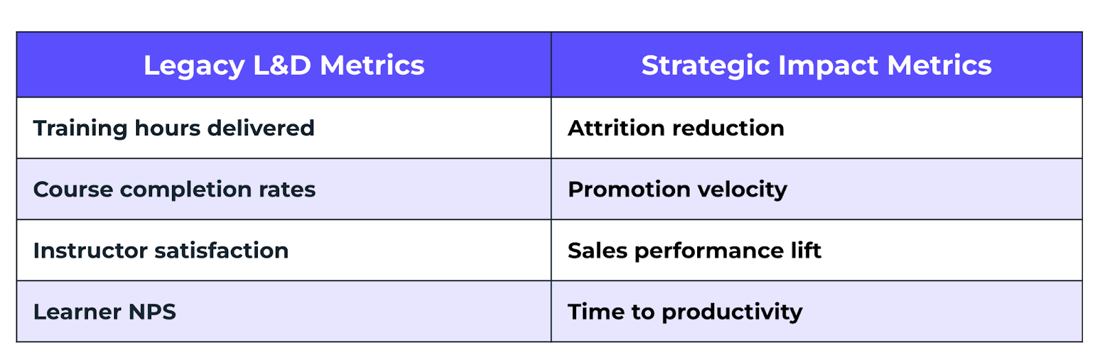 “You can still track completions,” Maise said, “but if that’s the only thing you’re reporting, you’ll stay invisible to the business.” The shift is about relevance. Strategic L&D teams don’t abandon learning metrics — they connect them to impact.