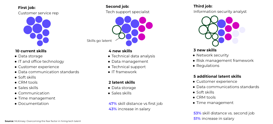 McKinsey research underscores the power of this mindset. On paper, a customer service rep, tech support agent, and security analyst may seem unrelated. But skills analysis shows significant overlap — just a few additional competencies can unlock internal mobility. That’s the case for skills-based workforce planning over role-based replacement.