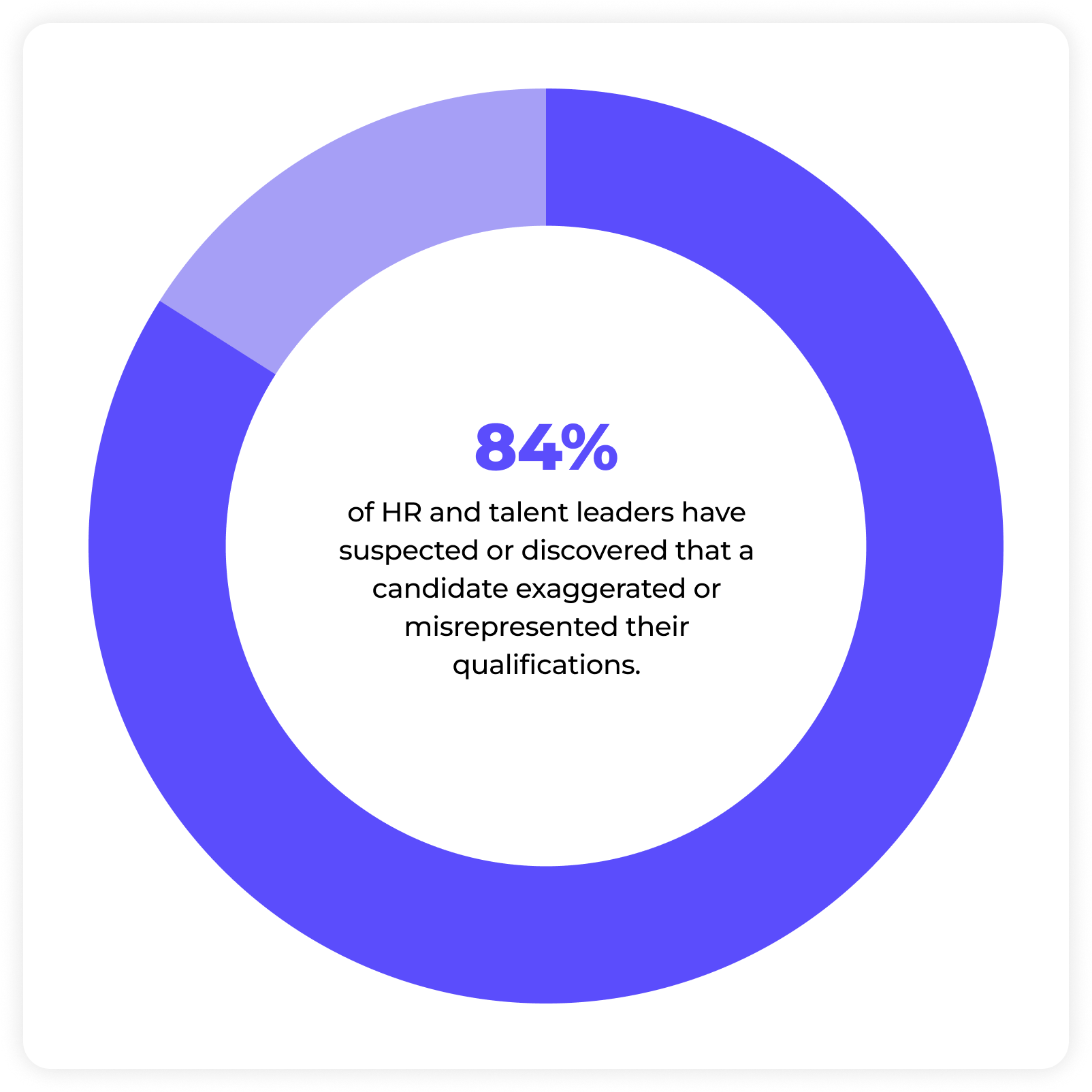 The reality is that it’s not easy to evaluate job candidates. Our survey reveals that the vast majority (84%) of HR and talent leaders have suspected or discovered that a job candidate exaggerated or misrepresented their qualifications. This is a widespread challenge that undermines confidence in all job candidates.