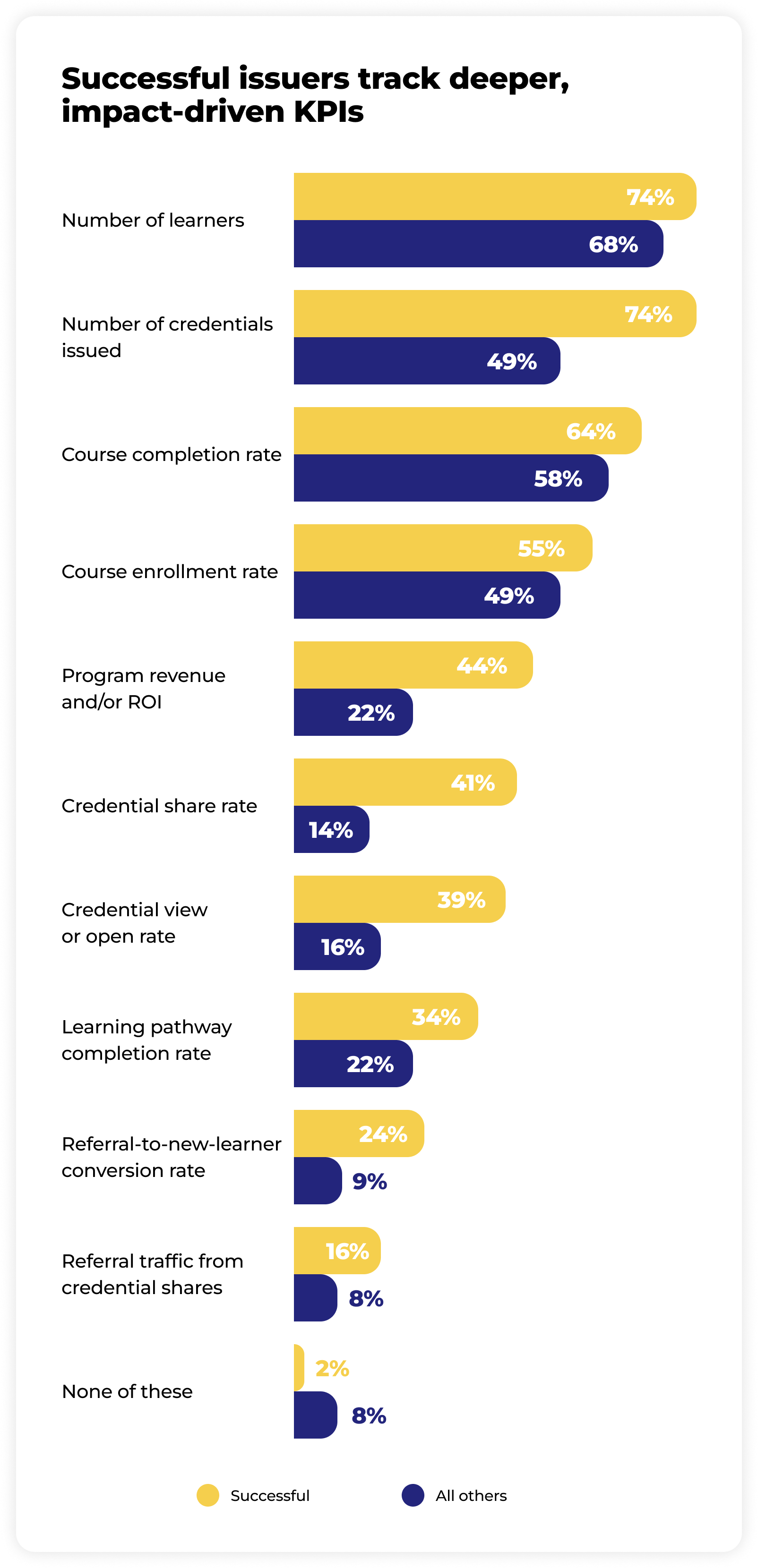 Most issuers track KPIs, but the difference between average and top-performing programs lies in what they track. While nearly all issuers measure basics like the number of learners or credentials issued, successful issuers focus on metrics that reflect program impact, learner engagement, and employer value.