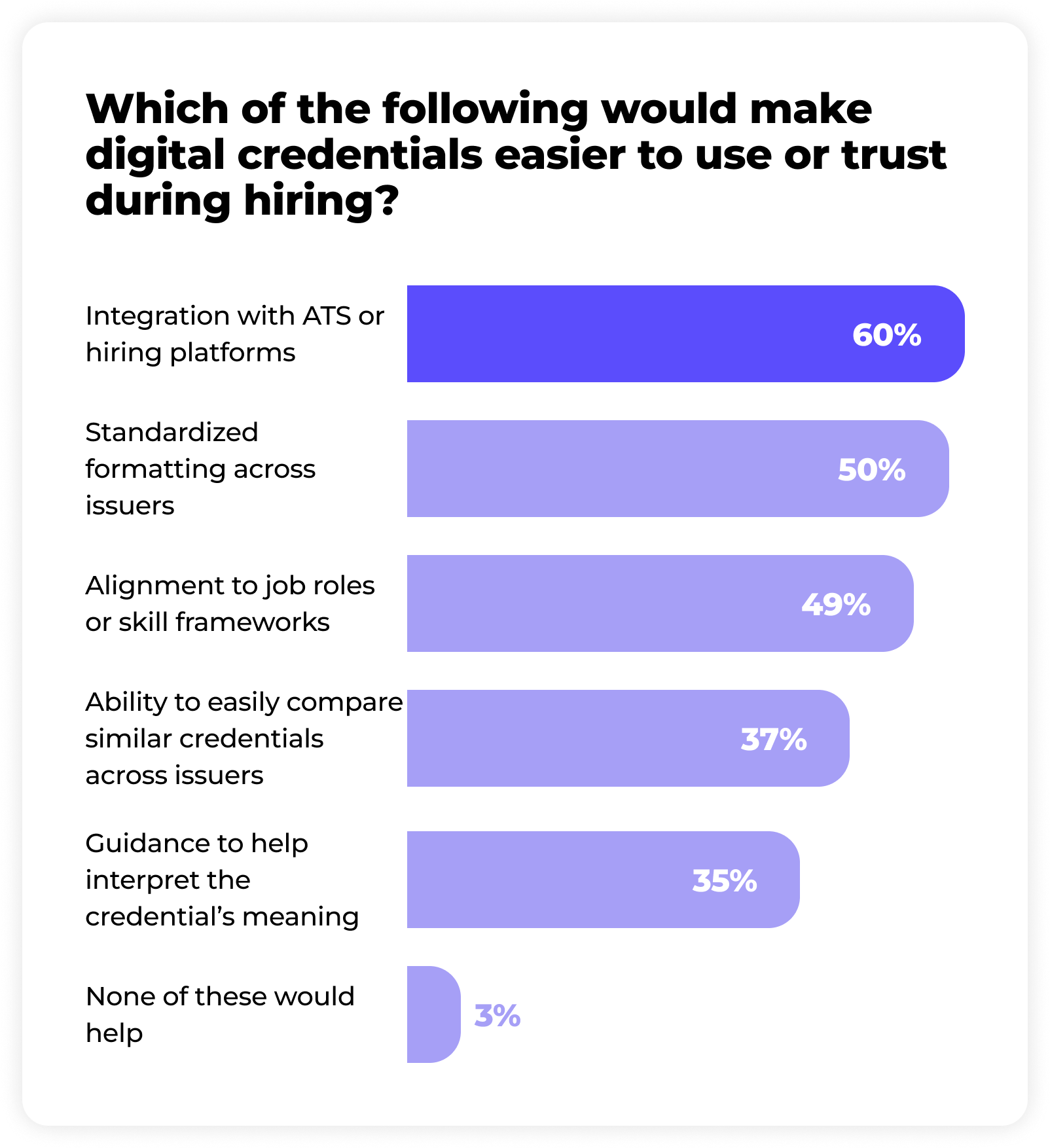 When we asked HR and talent leaders what would make digital credentials easier to use or trust, the top answer by far was integration with applicant tracking systems (ATS) and HR platforms (60%), followed closely by standardized formatting across issuers (50%) and alignment to recognized skill frameworks (49%). The message is clear: Hiring teams want credentials that are as easy to process and compare as resumes are.