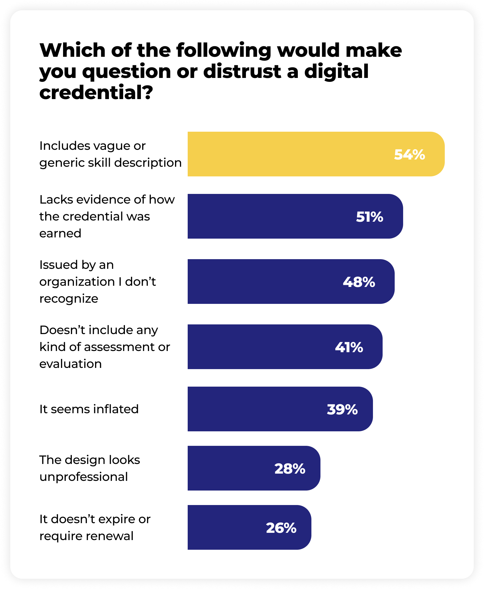 The takeaway is clear: Employers want this level of detail, but too many issuers aren’t providing it. These aren't minor oversights — they’re missed opportunities to strengthen employer trust, prove learner competency, and improve hiring outcomes. When credential metadata lacks the information employers are seeking, even highly qualified candidates risk being overlooked. Closing this gap transforms credentials from “nice to have” into indispensable hiring assets.